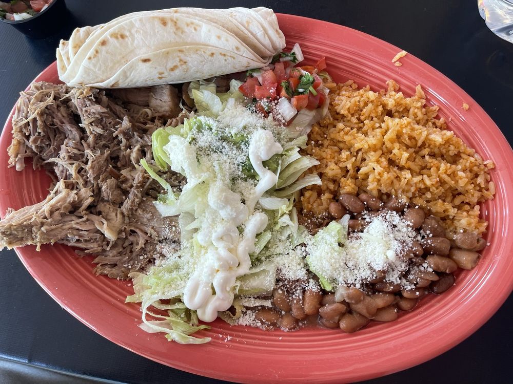 Two soft or crunchy street tacos filled with your choice of meat, onions, and cilantro. Garnished with lettuce, sour cream, and pico de gallo. Served with rice and beans.