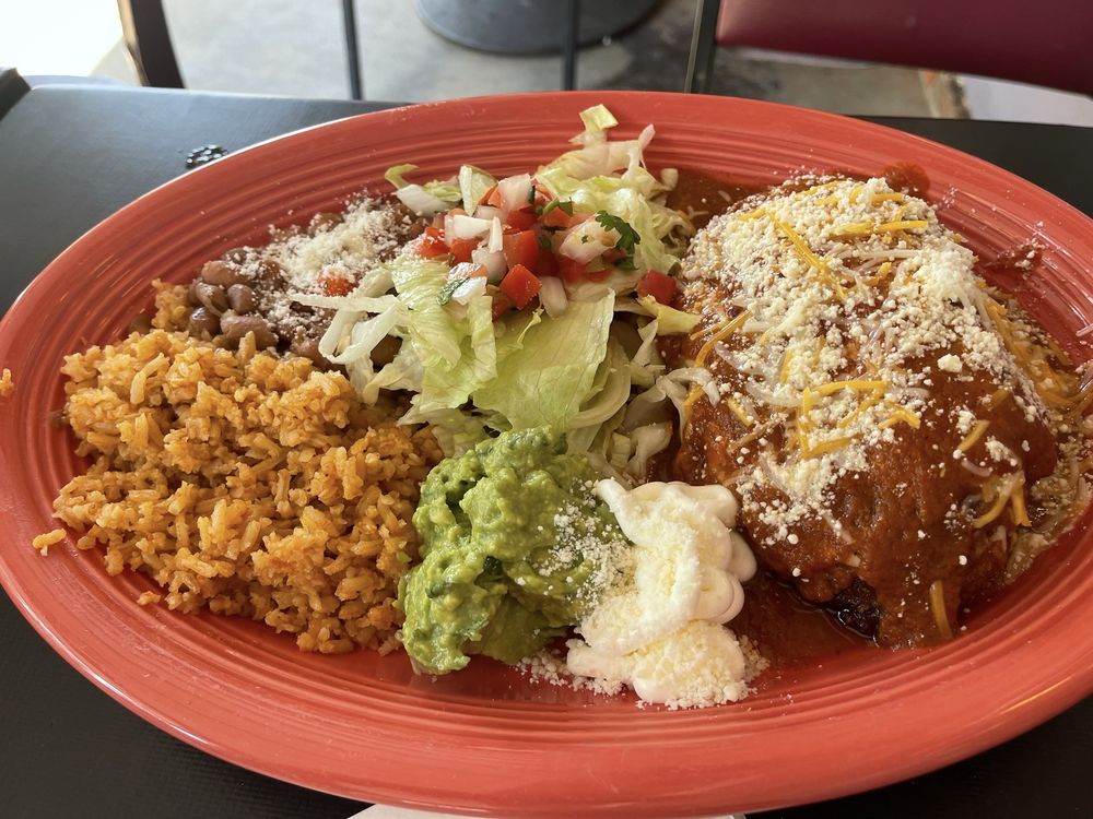 Vegetarian. A cheese-stuffed poblano chile, battered and deep-fried. Smothered in our house red sauce. Topped with shredded cheese, sour cream, and guacamole.
